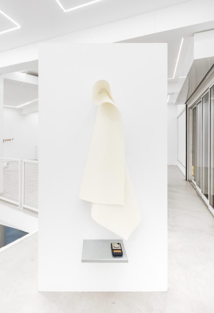 Before descending to the lower floor, More Pressure More Release offers an intimate pause. A length of fabric slowly rolls and unrolls, driven by a motor that alternates effort and surrender. The motion is cyclical, gentle, and fragile, giving the fabric a sculptural presence without ever allowing it to settle. At each cycle, its end brushes against the plate of a precision scale designed to measure a weight that cannot be named.
