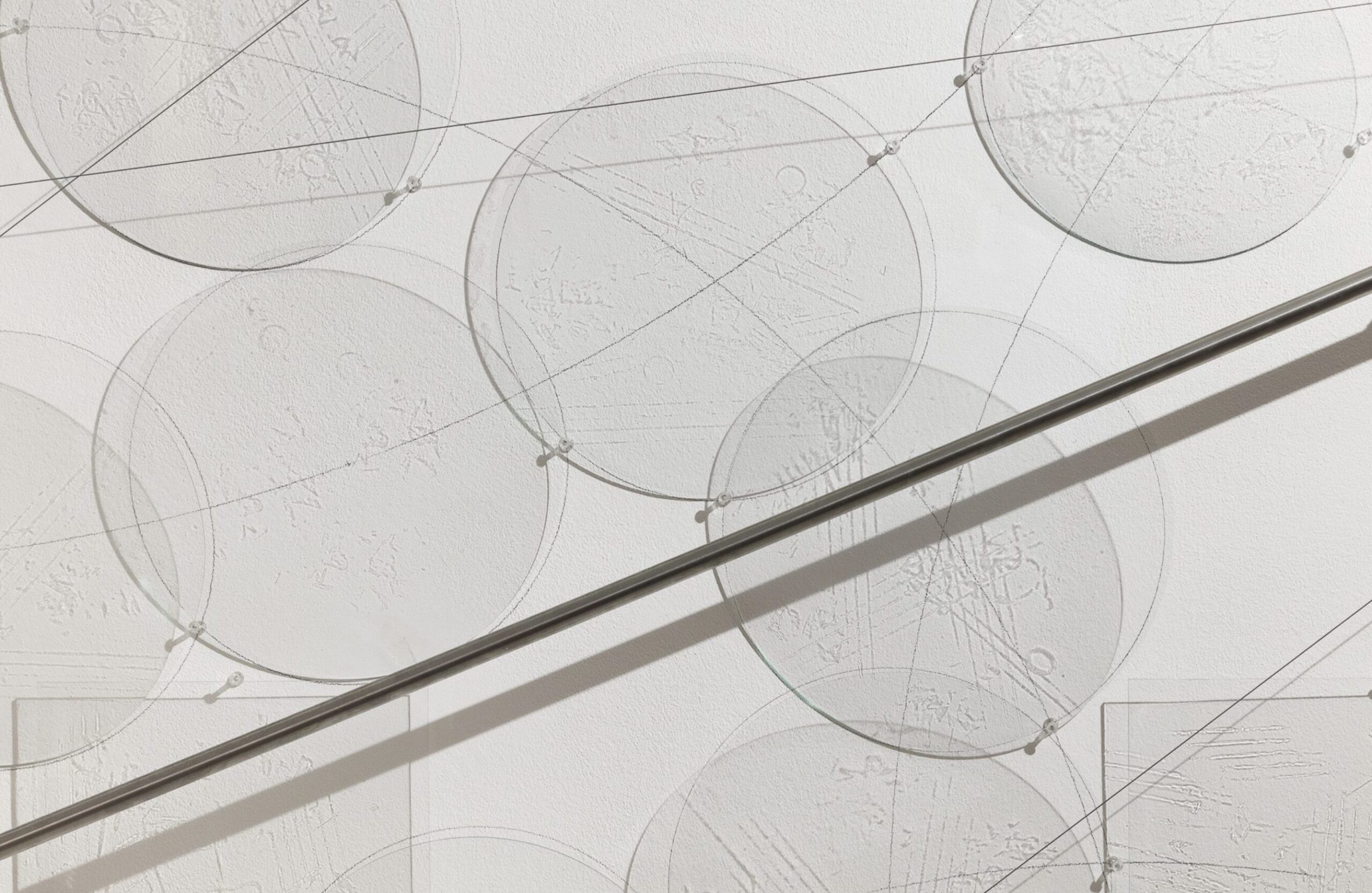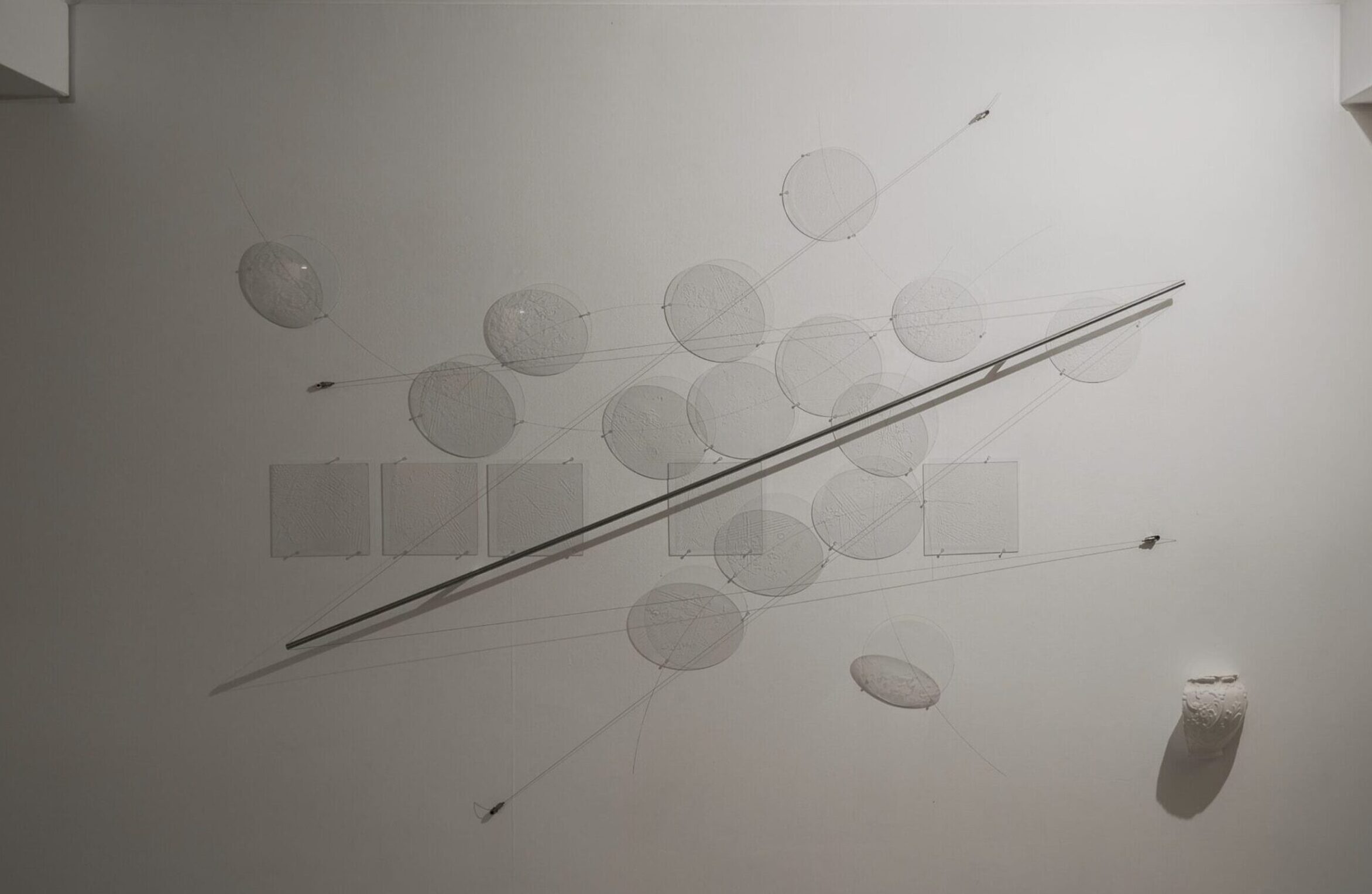 Downstairs, Fake Flowers At The Entrance plays with perceptual ambiguity. Thin fragments of glass, arranged with meticulous precision, seem to dissolve into their own shadows, while a steel rod evokes a needle probing a volume that does not exist. Here, materiality paradoxically reveals itself through near-disappearance, as if magnified under a microscope.