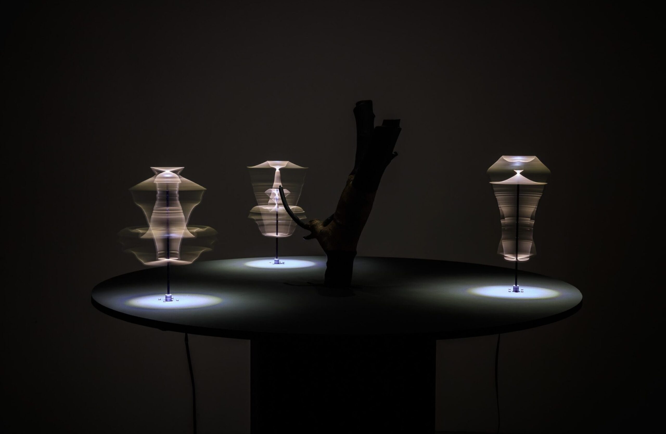 In the dim light, Expansion Tank presents the silhouette of a glass vessel that appears to expand and contract as it rotates around its axis. Its form seems to breathe, modulated by speed and by the reflected light filtering down from the upper floor. This rhythmic motion acts as a prelude to the darkest space of the gallery, where Dancing Affordance directly addresses the mechanisms of perception. Two-dimensional profiles of a tree branch, when rotated at high speed, generate alternative objects, multiple possible interpretations of a single reality, revealing that affordance belongs neither to the object nor to the observer, but to the relationship between the two.