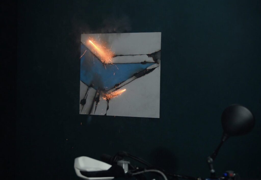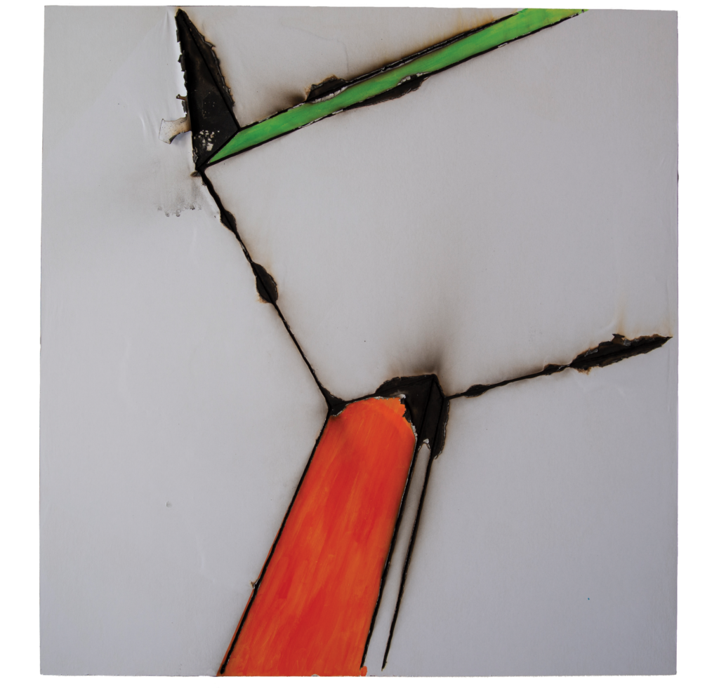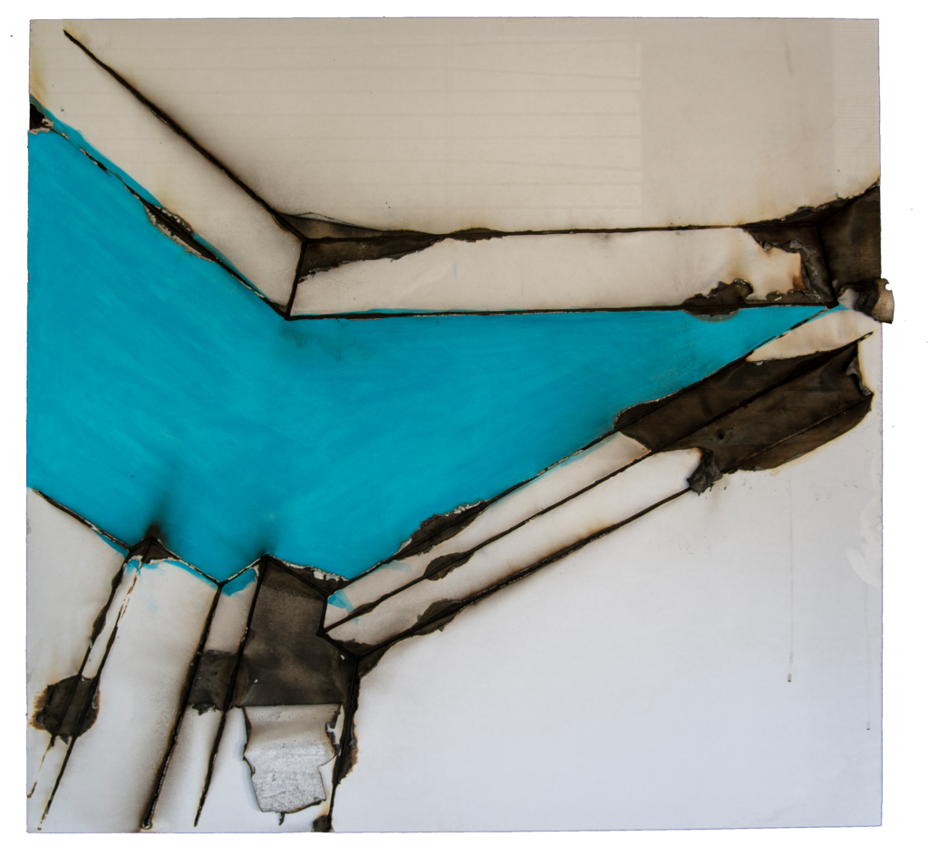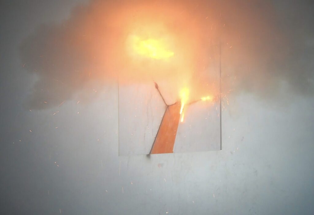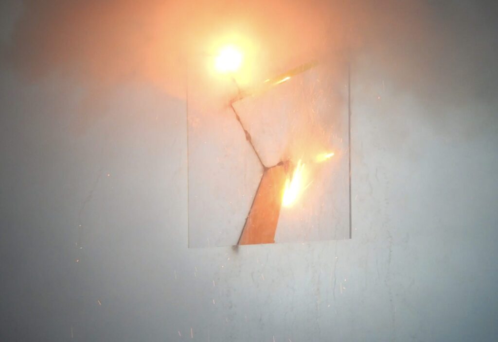 For the second exhibition in the VUG space, the public is initially invited to watch a performance from outside that takes place inside and is visible through the large glass window of the studio. The public is prevented from entering as a matter of safety, as the performance is in fact based on the use of slow-burning fuses that are ignited by the artist to create the live works. Once completed, the public can enter to observe them more closely, although the accumulated smoke makes the visit less comfortable.
