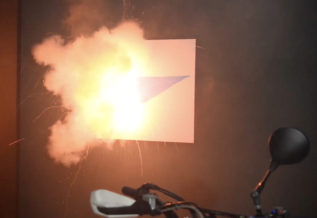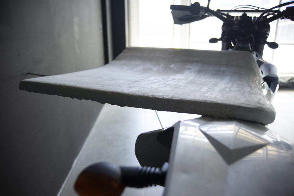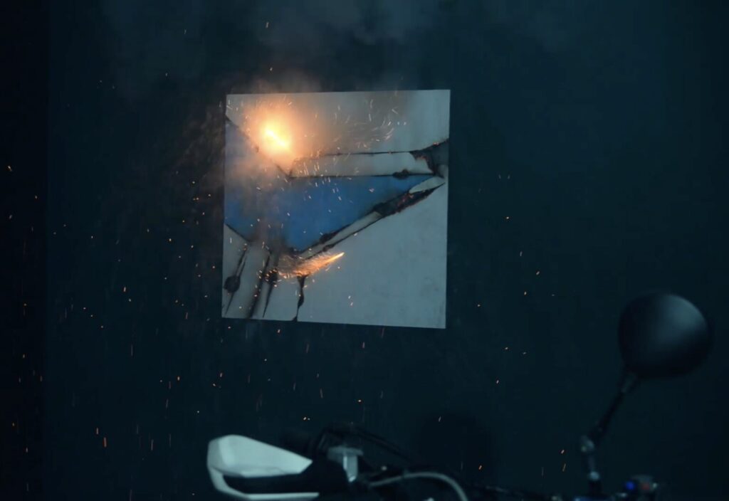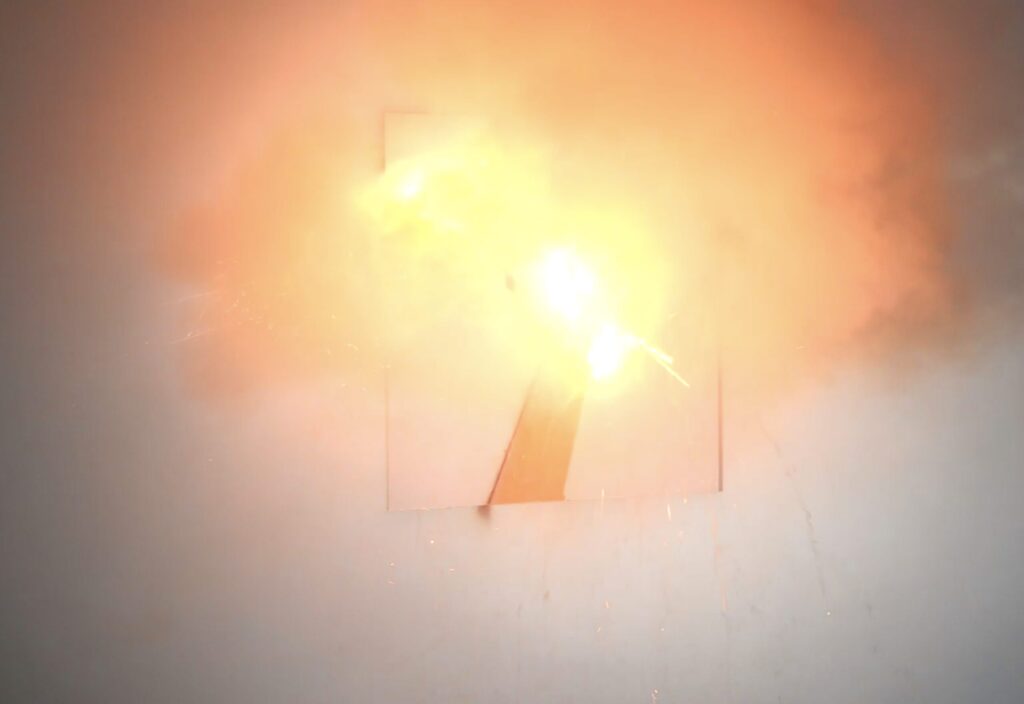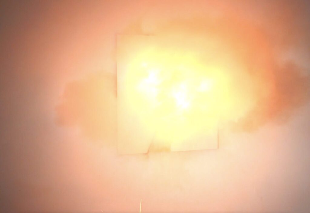 For the second exhibition in the VUG space, the public is initially invited to watch a performance from outside that takes place inside and is visible through the large glass window of the studio. The public is prevented from entering as a matter of safety, as the performance is in fact based on the use of slow-burning fuses that are ignited by the artist to create the live works. Once completed, the public can enter to observe them more closely, although the accumulated smoke makes the visit less comfortable.